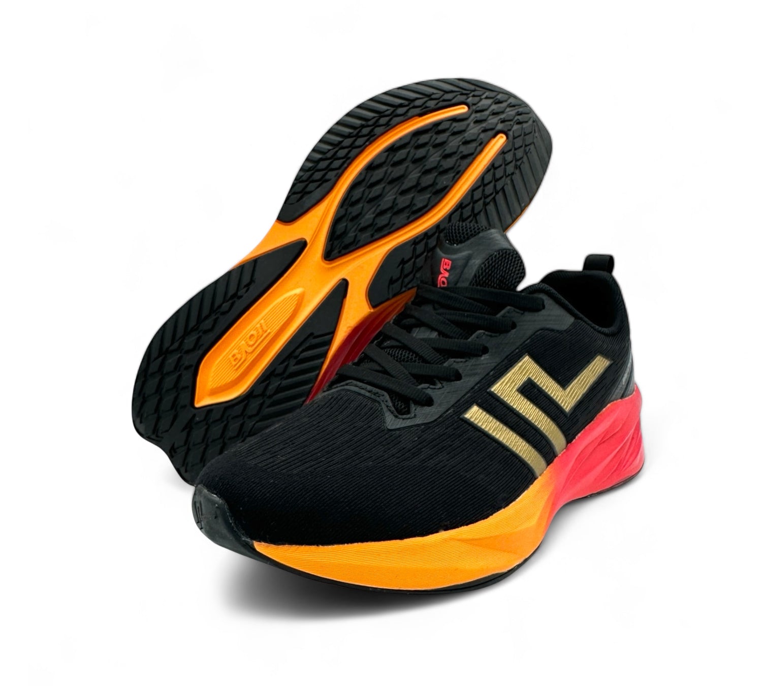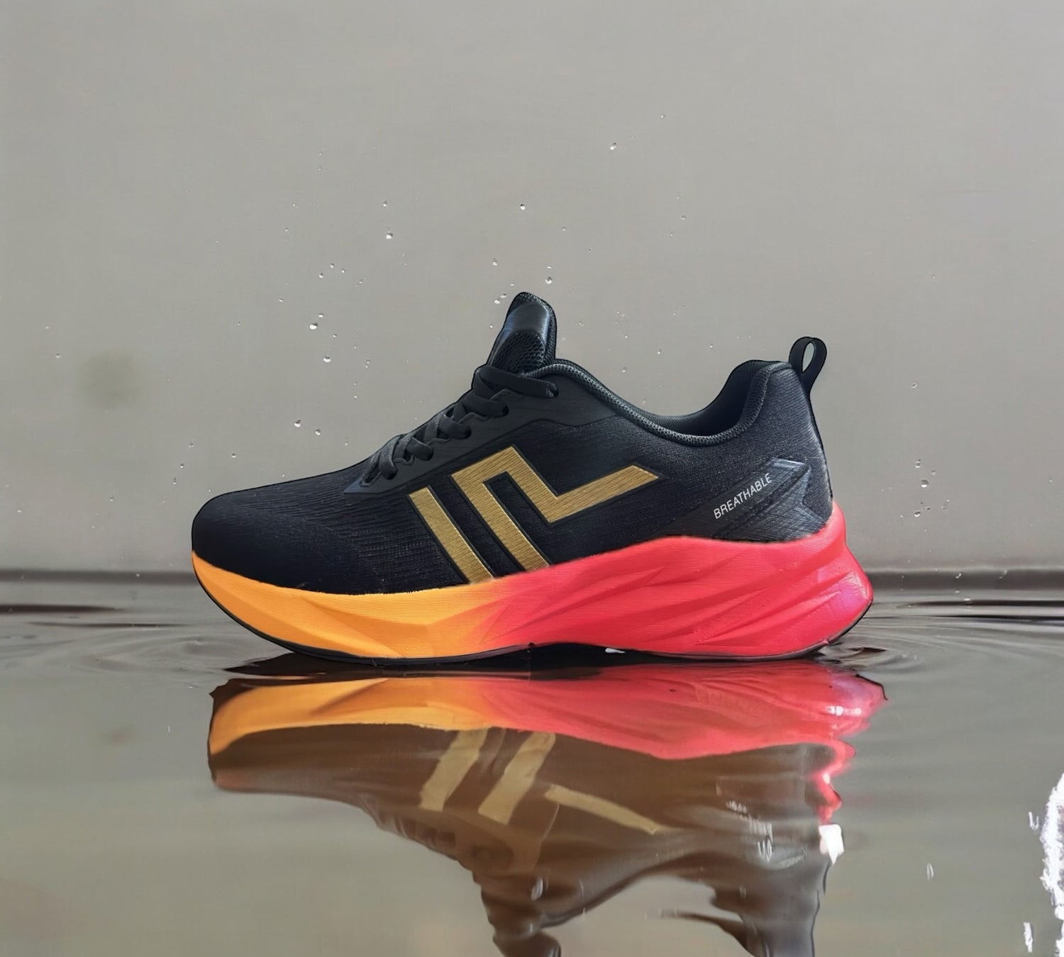 Embrace the season with Sunset Striders, where sleek black meets vibrant red and orange accents for a stylish look.